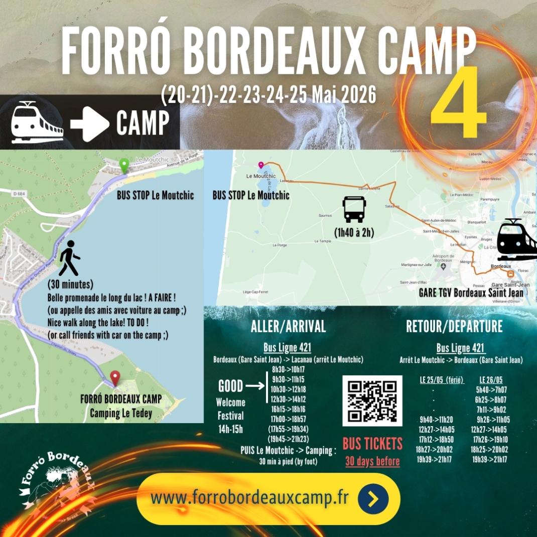 Transports en commun depuis Gare : BUS Ligne 421 direction Lacanau (descendre à l'arrêt Moutchic), puis 30 minutes de marche jusqu'au camping (belle promenade le long du lac, à faire !)( ou appelle des amis avec voiture au camp)