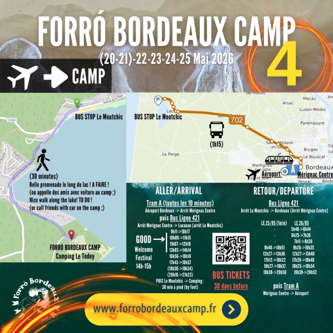 Transports en commun depuis Aéroport : Tram A jusqu'à Arrêt Mérignac Centre, puis BUS Ligne 421 direction Lacanau (descendre à l'arrêt Moutchic), puis 30 minutes de marche jusqu'au camping (belle promenade le long du lac, à faire !)