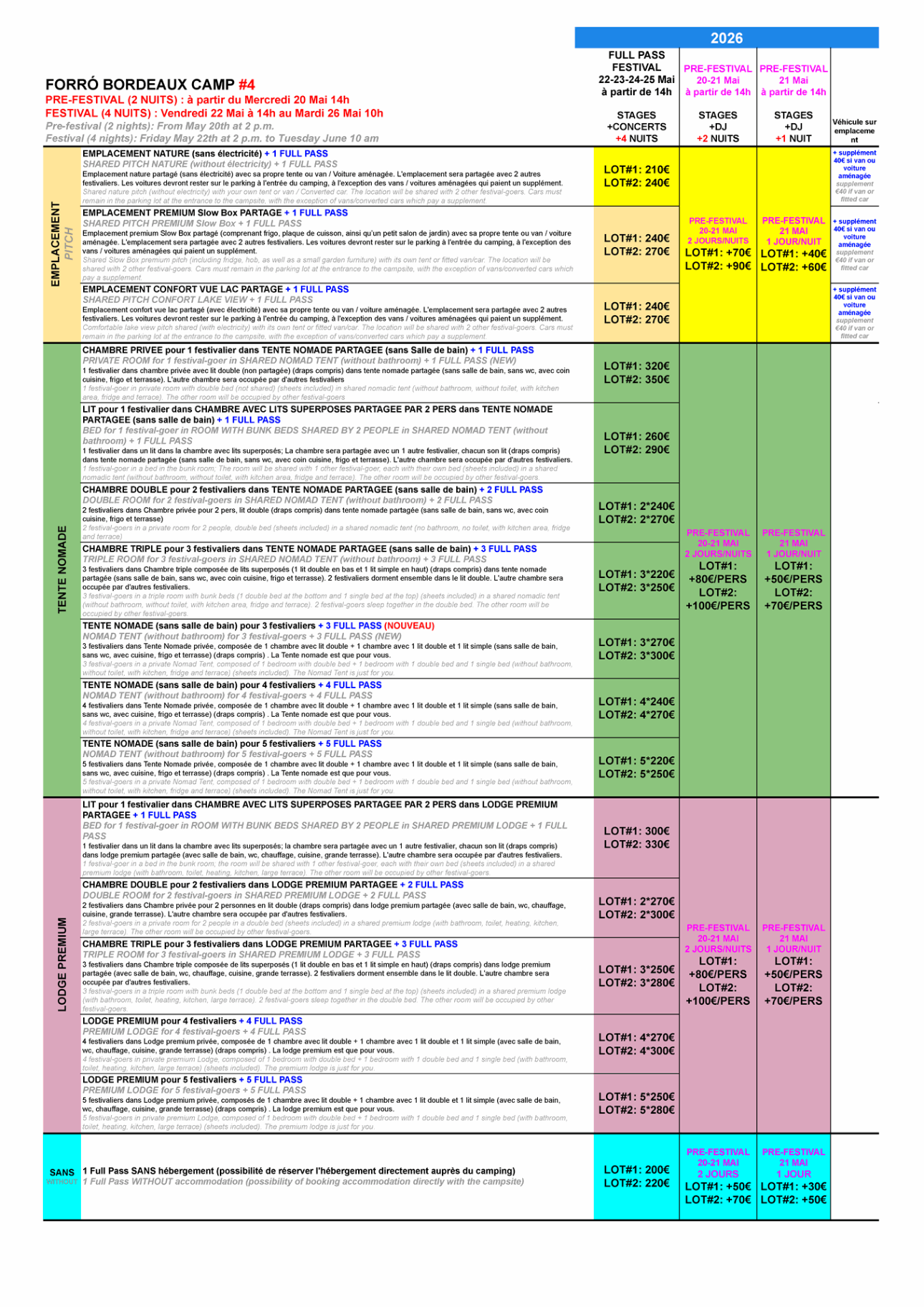 IMPORTANT: Arrivals must be made before 9 p.m. on Friday evening, end of reception at the entrance to the campsite. After 9 p.m., there will no longer be reception, you will not be able to pitch your tent in the pitches, and access to lodges or nomadic tents will be complicated. After 11 p.m., you will have to sleep in the outdoor parking lot of the campsite..